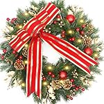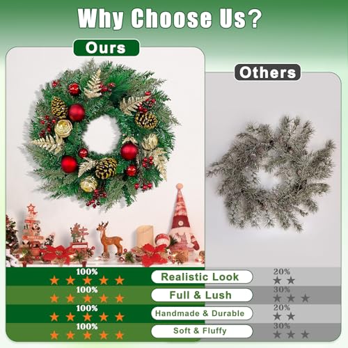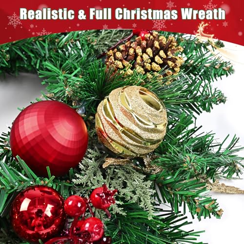 Full & Abundant Christmas Wreath: Made of high-quality material, our Christmas wreath for front door welcomes the holiday spirit with luscious ornaments, vivid red berries, lifelike pine cones and glittering leaves. The natural branches artfully arranged on wreath base, each handcrafted wreath dazzles with a red bow, creating a heartwarming display.